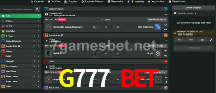 O G777 Bet oferece uma grande seleção de opções de apostas em e-sports com probabilidades competitivas